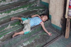 Und plötzlich zupft Liza mich am T-Shirt und deutet auf ein kleines Mädchen, welches auf einer Treppe in einem Hauseingang liegt. Erschrocken von dem Anblick, wir dachten Beide, das Mädchen wäre tot. Sie lag auf dem Rücken über zwei Treppenstufen, die Augen wie bei einer Katze minimal geöffnet. Schnell war klar, das ca. 5 Jahre alte Mädchen schläft nur. Es lag mitten auf dieser Treppe, allein, ohne Schutz. Menschen stiegen über das Mädchen wie über einen Sack Reis. In diesem Moment wusste ich nicht, ob ich wütend oder traurig sein soll. Liza hatte die Eltern schnell ausfindig gemacht, sie saßen nicht weit davon an ihrem Schlafplatz auf dem Gehsteig. Liza brachte die Eltern dazu, ihre Tochter hinter sich in den Schatten auf einen Karton abzulegen. Ich konnte mein Entsetzen kaum zurückhalten.